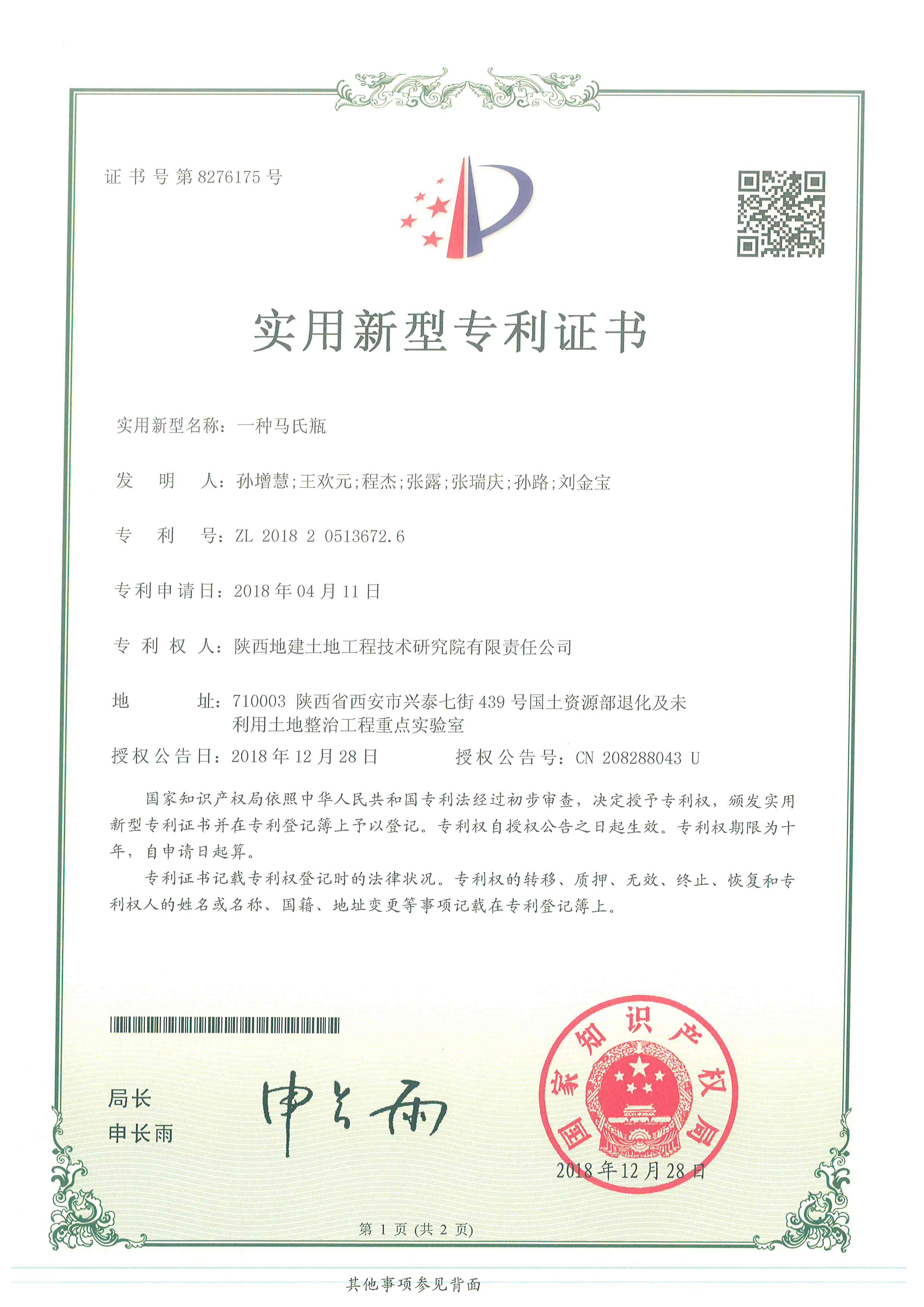 一种马氏瓶-实用新型证书